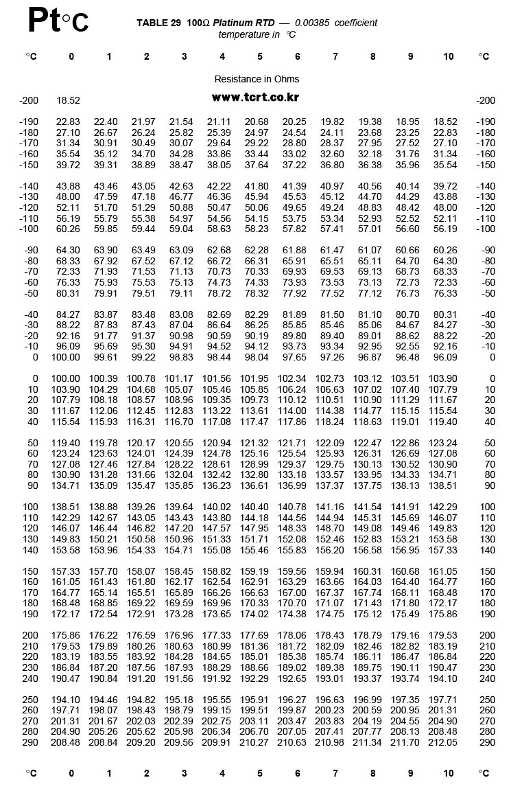 ⁂ PT 100Ω 온도저항표를 첨부합니다.
